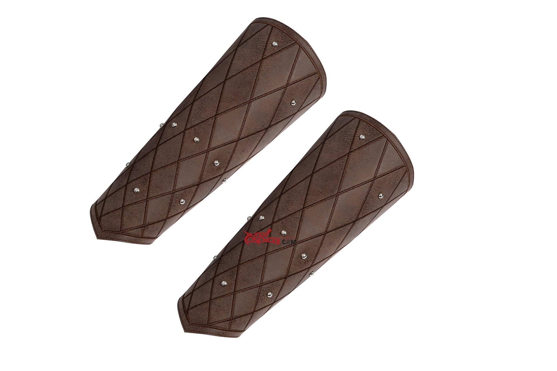Aged faux leather (belt/bracers) with artificial grimoire-stain patina.