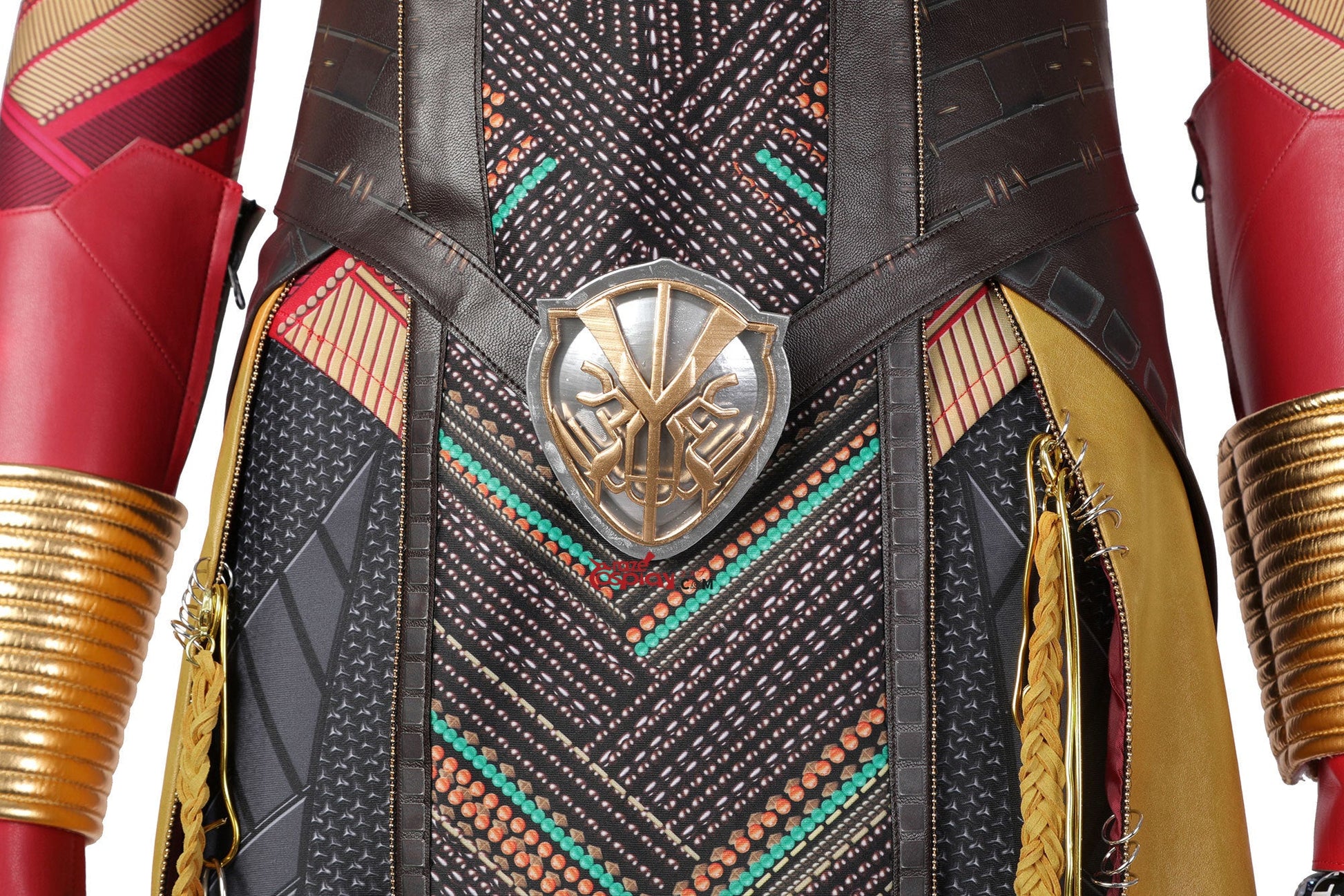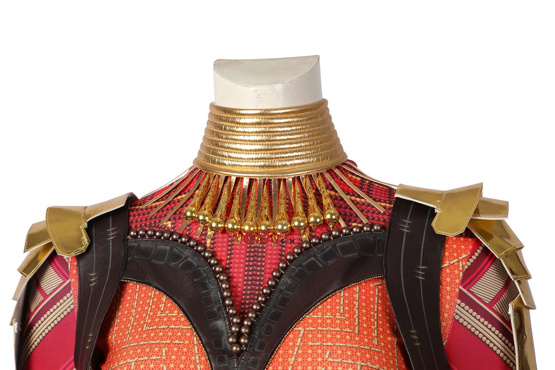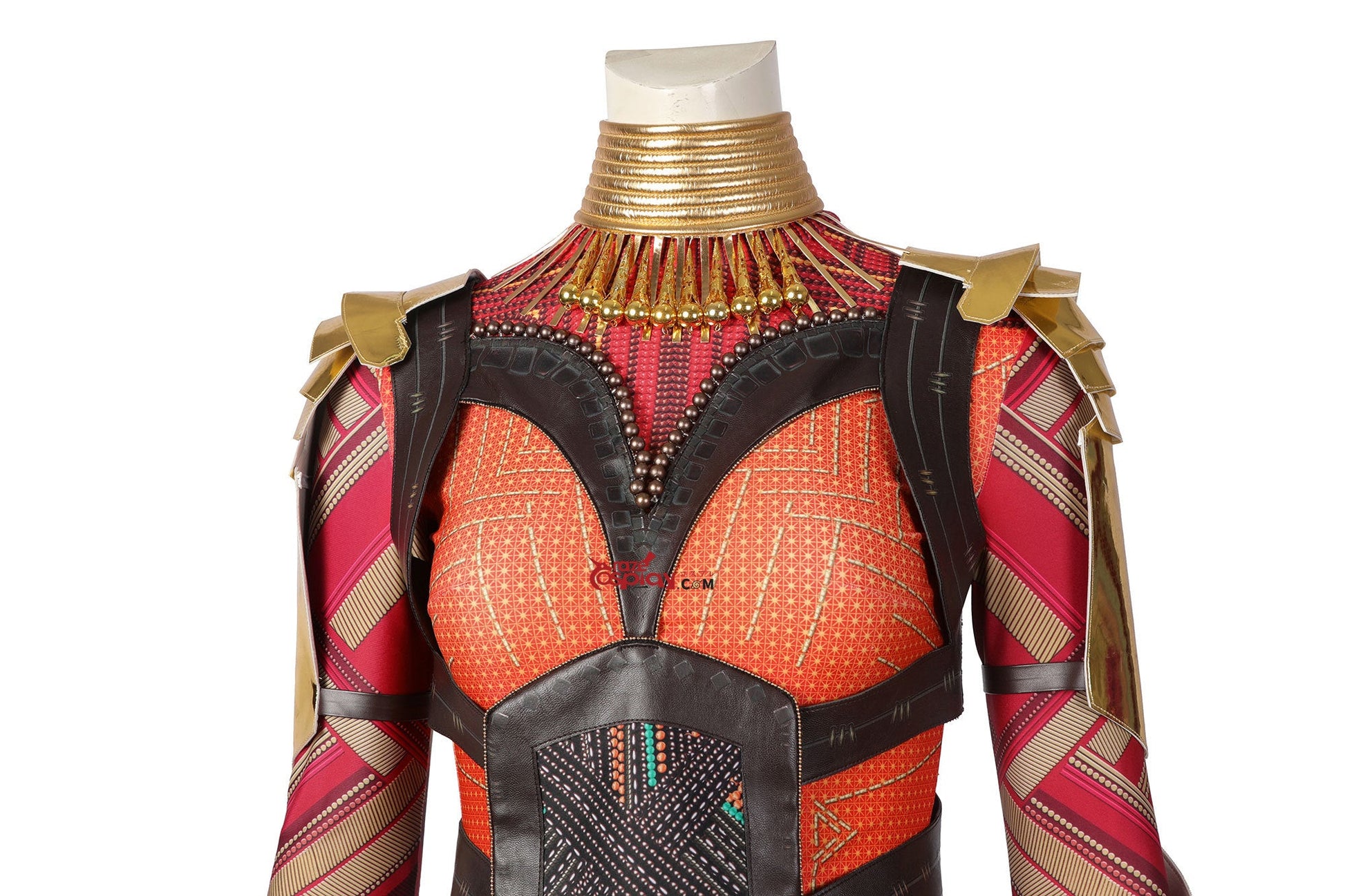 Embroidered tactical top, Reinforced combat pants, Adjustable crossbody harness, Layered waist sash, Shoulder armor x2, Arm guards x2, Neck armor collar, Beaded earrings x2, Warrior-beaded bracelet, Wrist guards x2.