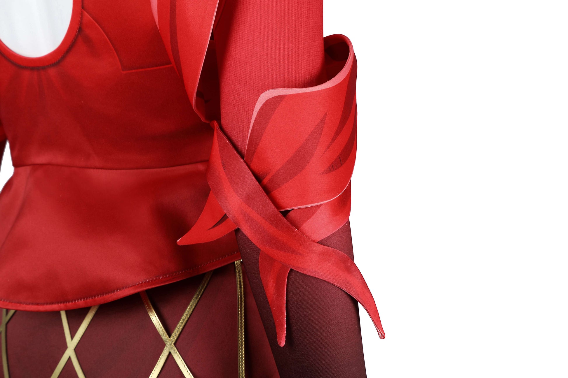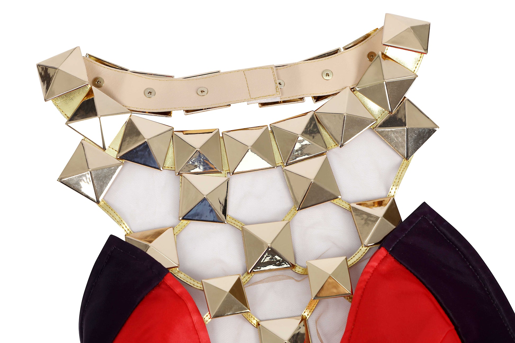 Includes: 1. Top 2. Skirt 3. Gloves 4. Bodystocking 5. Gold Trim 6. Invisible Shoulder Straps 7. Ear Clips 8. Headpiece