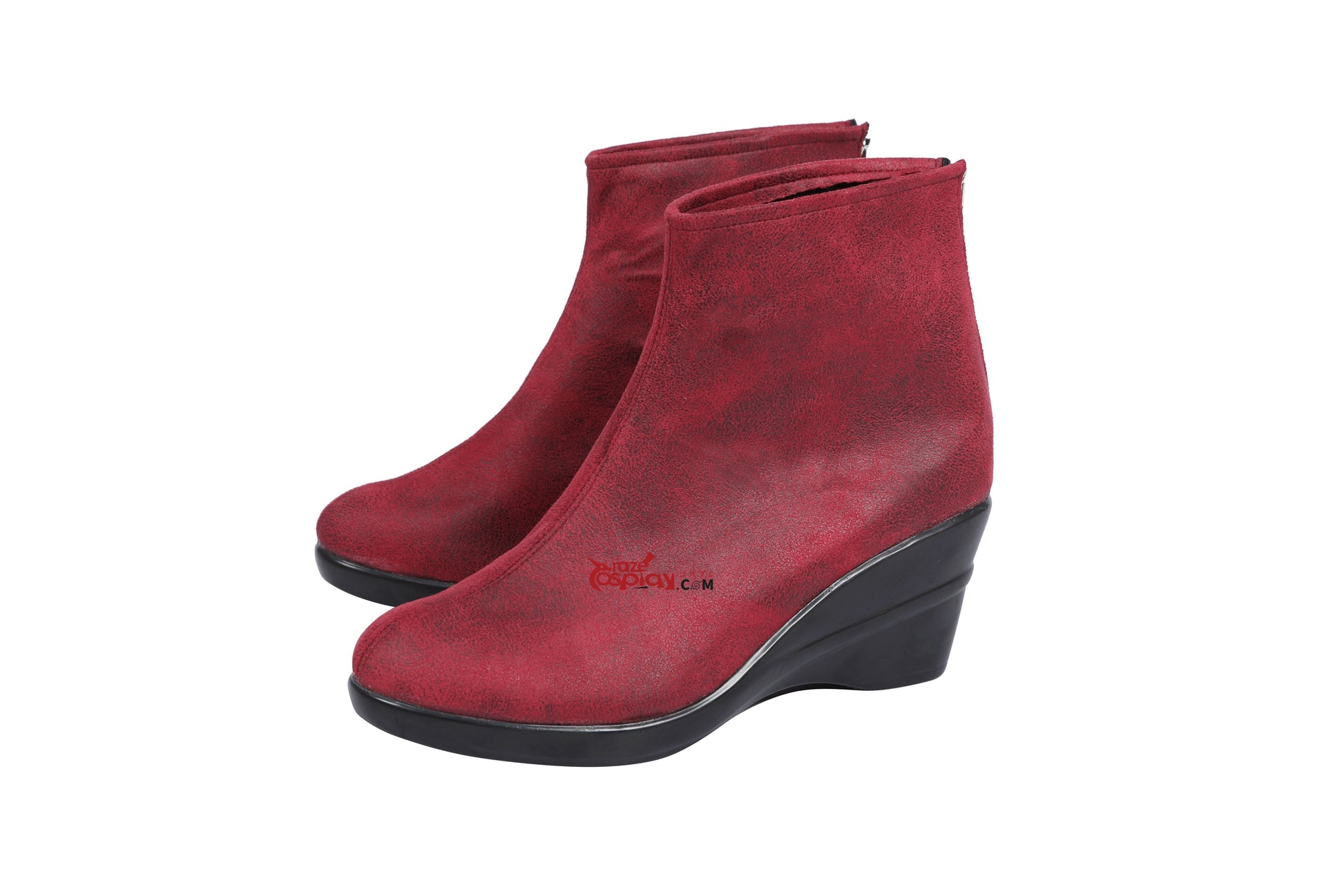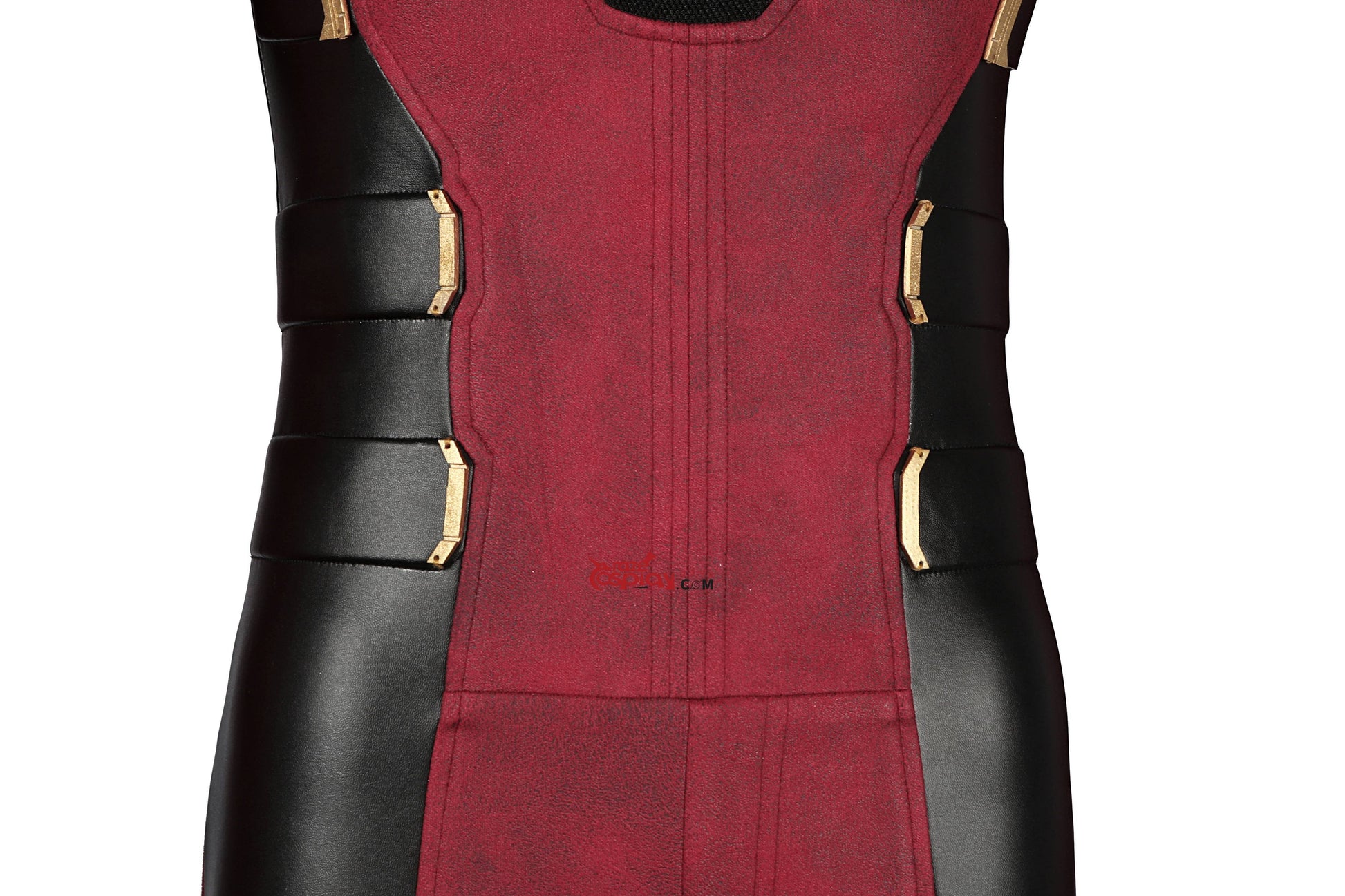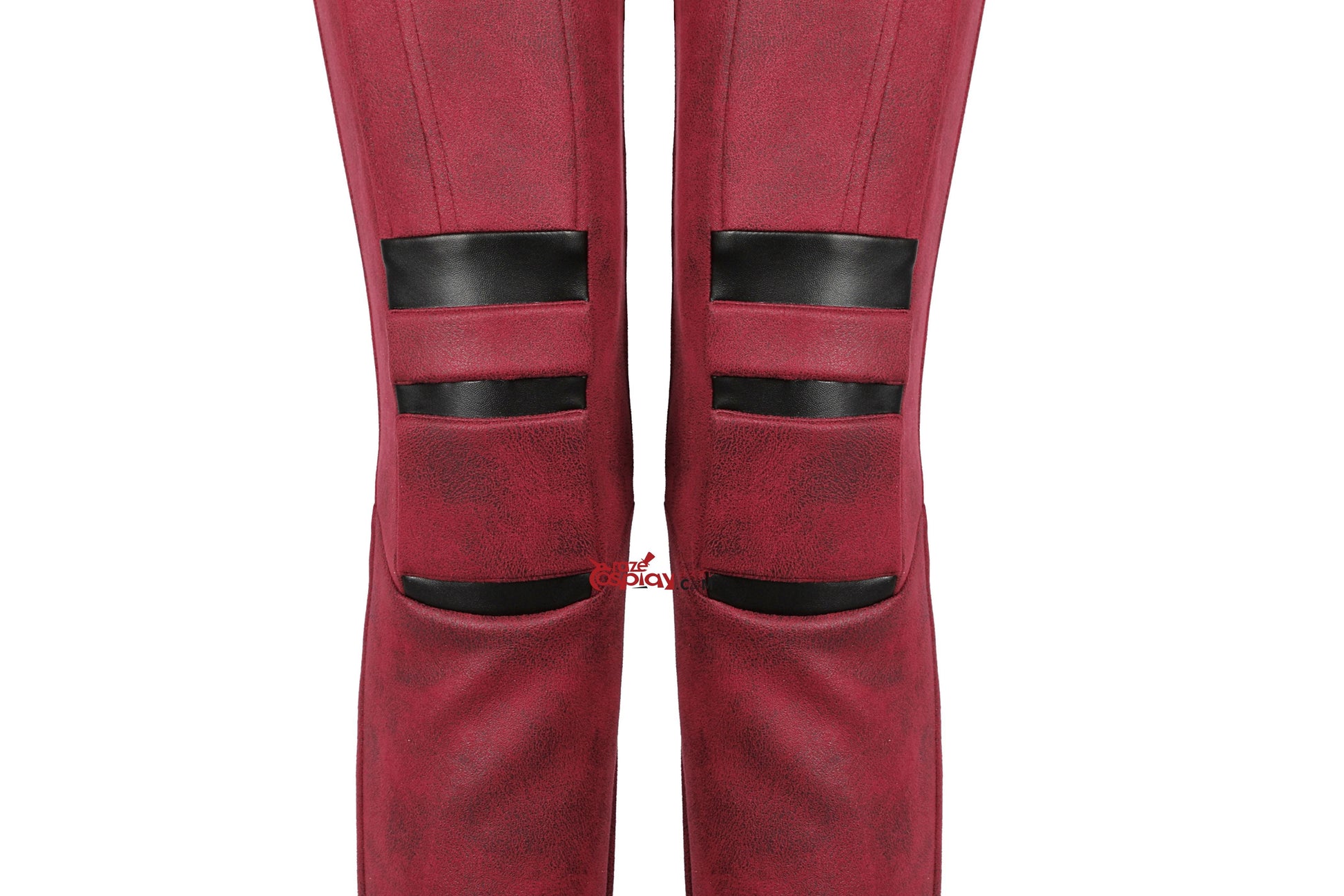 Jumpsuit: Red suede microfiber (slight stretch), textured knit fabric (slight stretch), sheepskin-textured four-way stretch black leather (stretch), EVA foam (non-stretch).