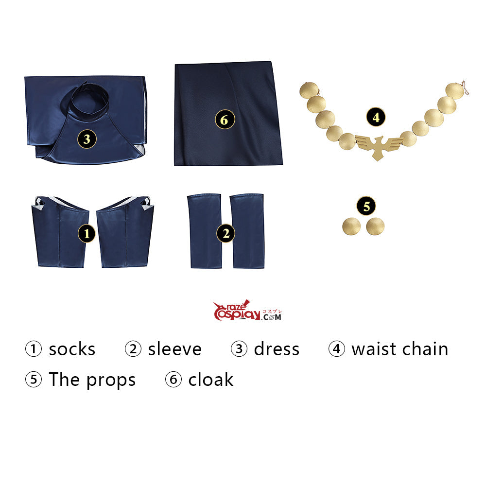 Components: Embroidered thigh-high socks, Spellwoven sleeves, Gothic layered dress, Chain belt with Azarathian runes, Front collar emblem, Hooded cape.