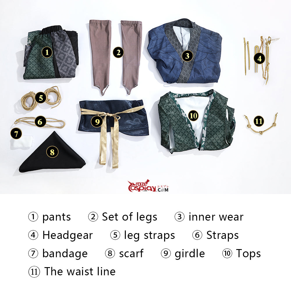 Pants, Leggings, Undergarment, Headpiece, Leg Straps, Wrist Straps, Bandages, Neck Wrap, Corset Belt, Top, Waist Cord