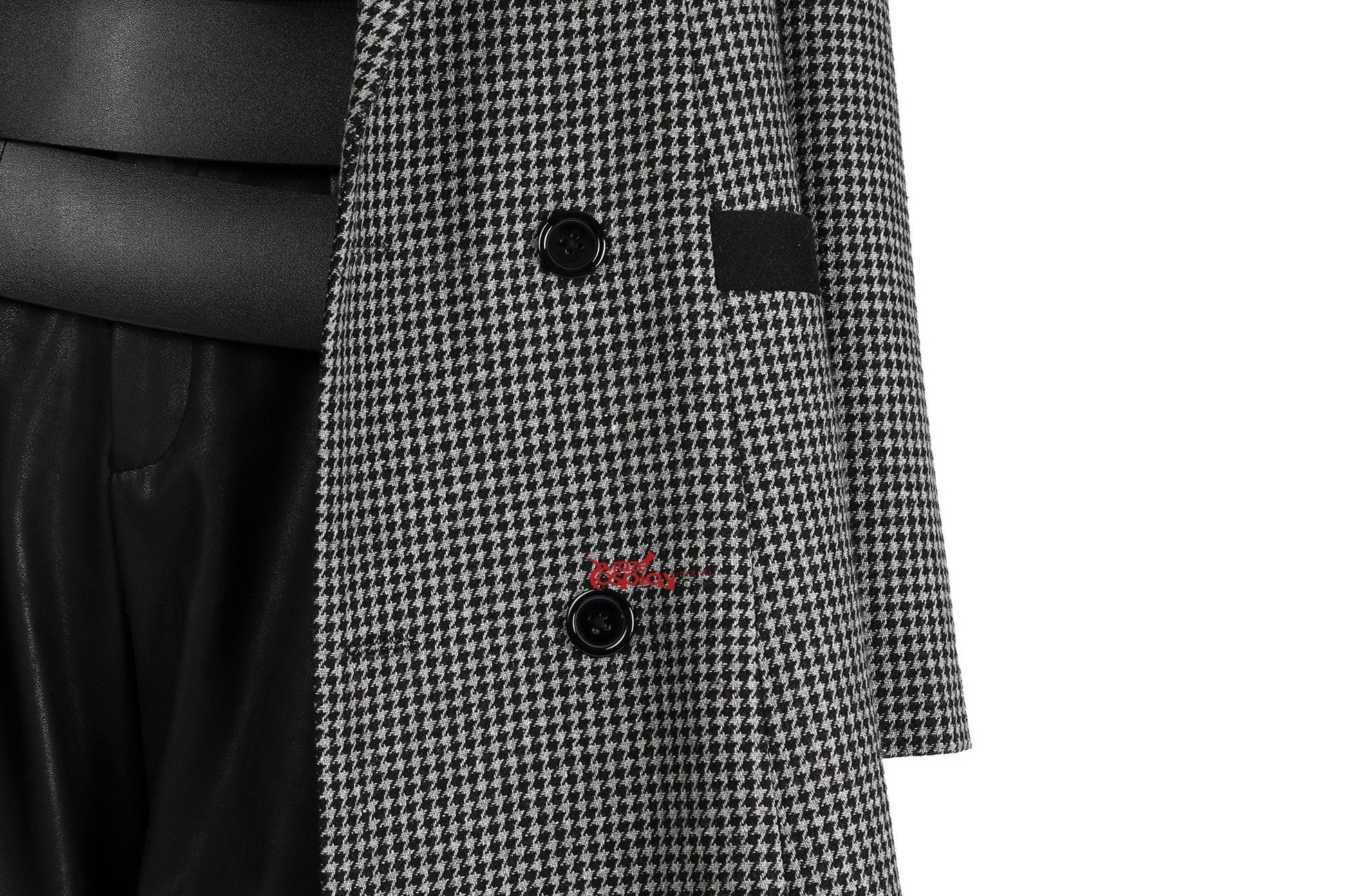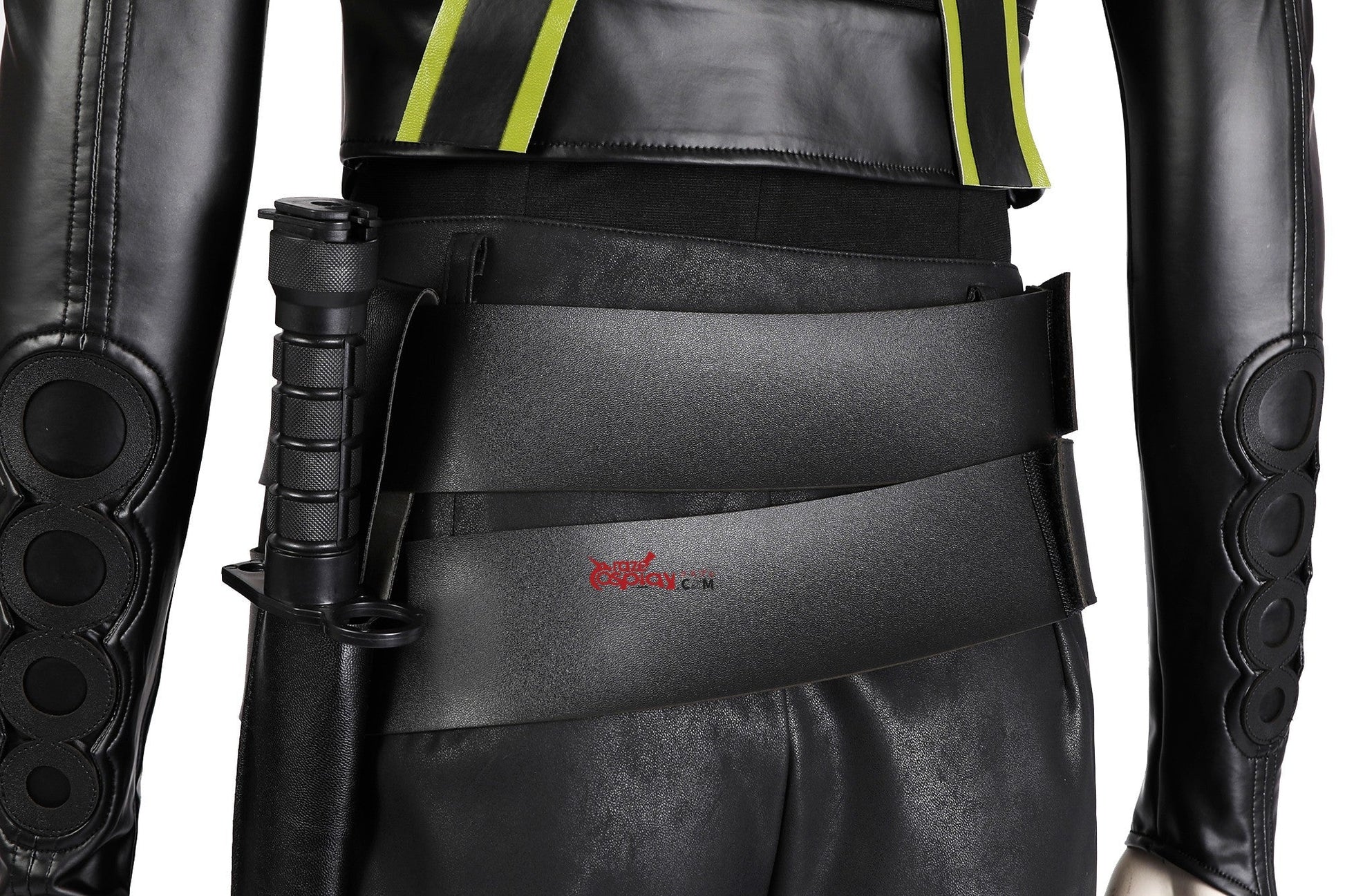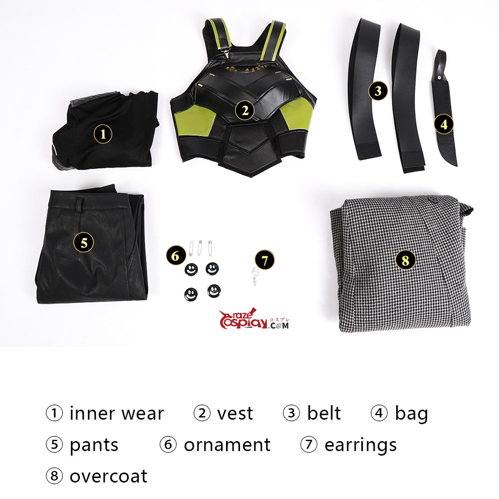 Components: Base layer shirt, Quilted tactical vest, Utility belt, Blade holster pouch, Reinforced pants, Asgardian-inspired accessories, Dagger-shaped earrings, Iconic trench coat.