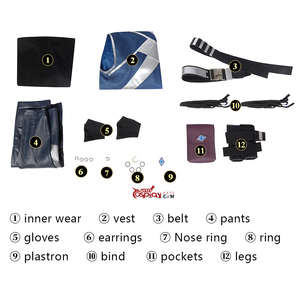 Innerwear, Vest, Belt, Pants, Gloves*2, Earrings*4, Nose ring, Rings*5, Chest ornament, Hand wraps, Waist bag, Leg pouch