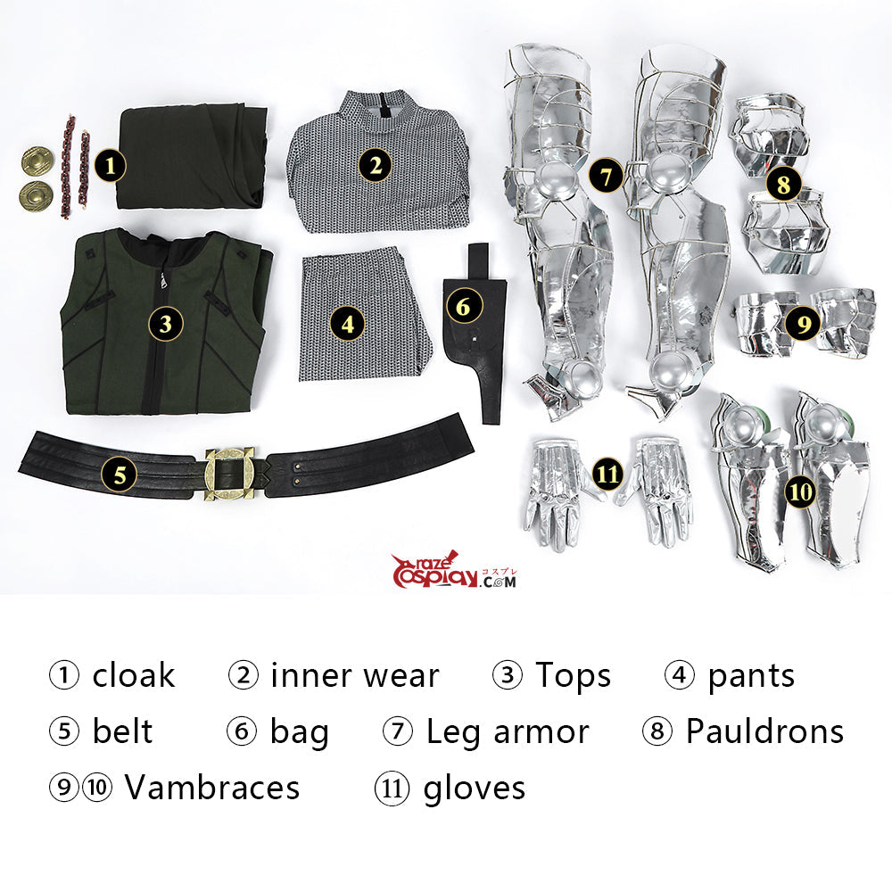 Components: Layered cape, Undershirt, Reinforced tunic, Base pants, Belt, Utility pouch, Leg armor, Pauldrons, Upper arm guards, Forearm guards, Gauntlet gloves.