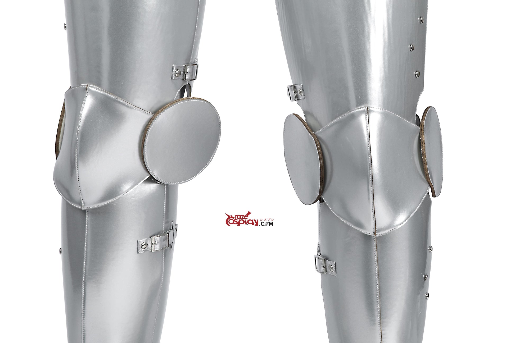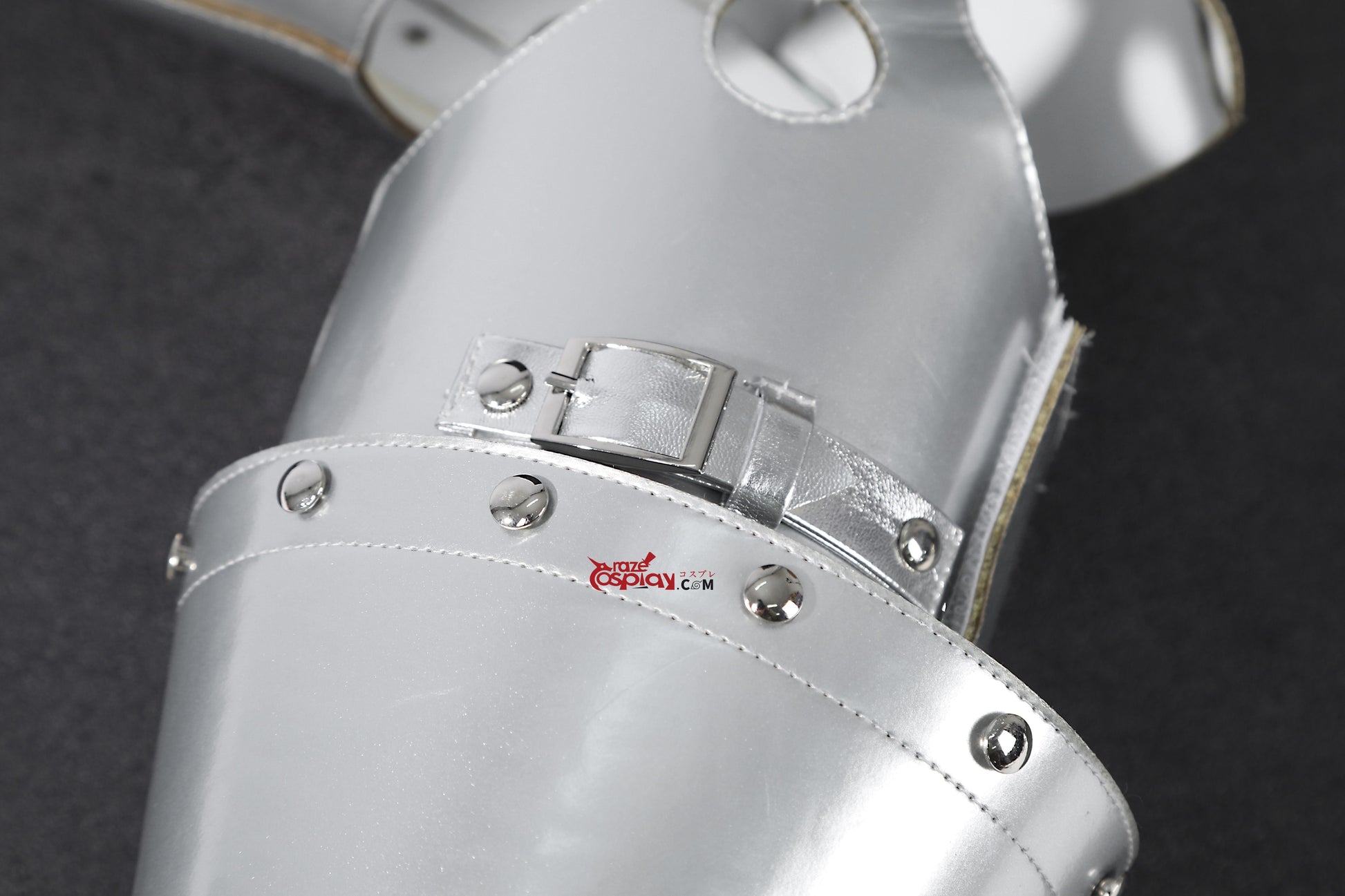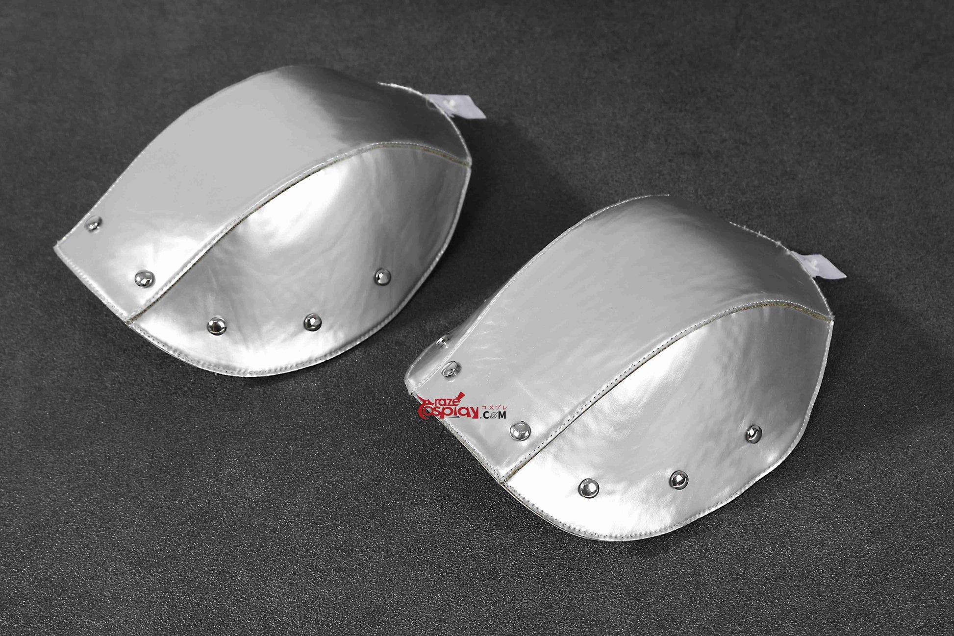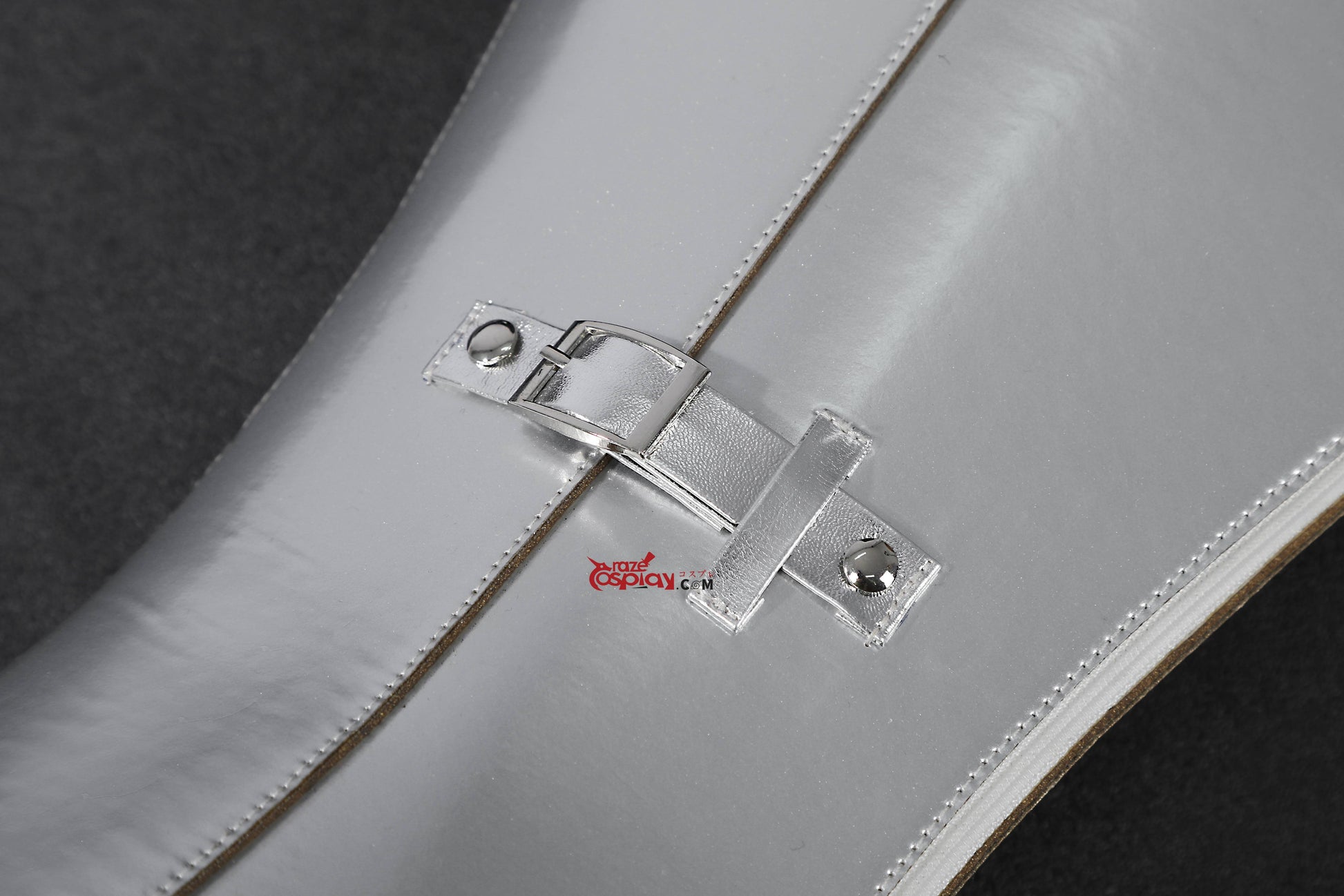 Arm/Thigh Guards: Pearlescent silver leather (non-stretch), PU leather (non-stretch).