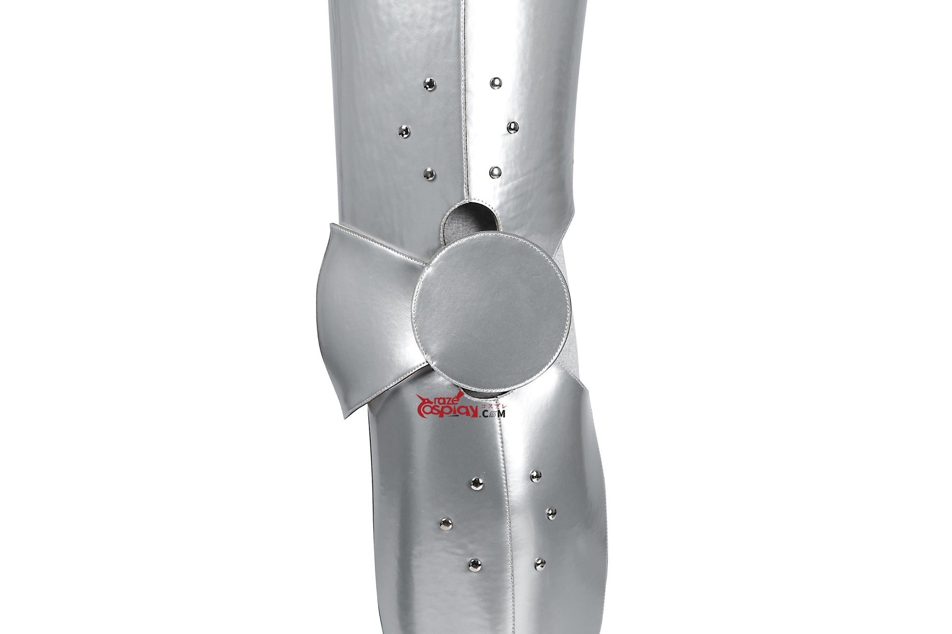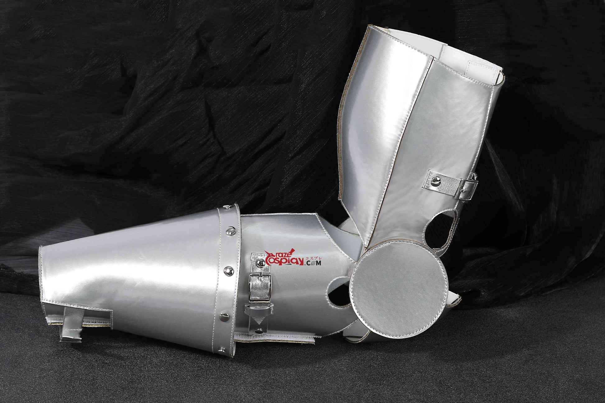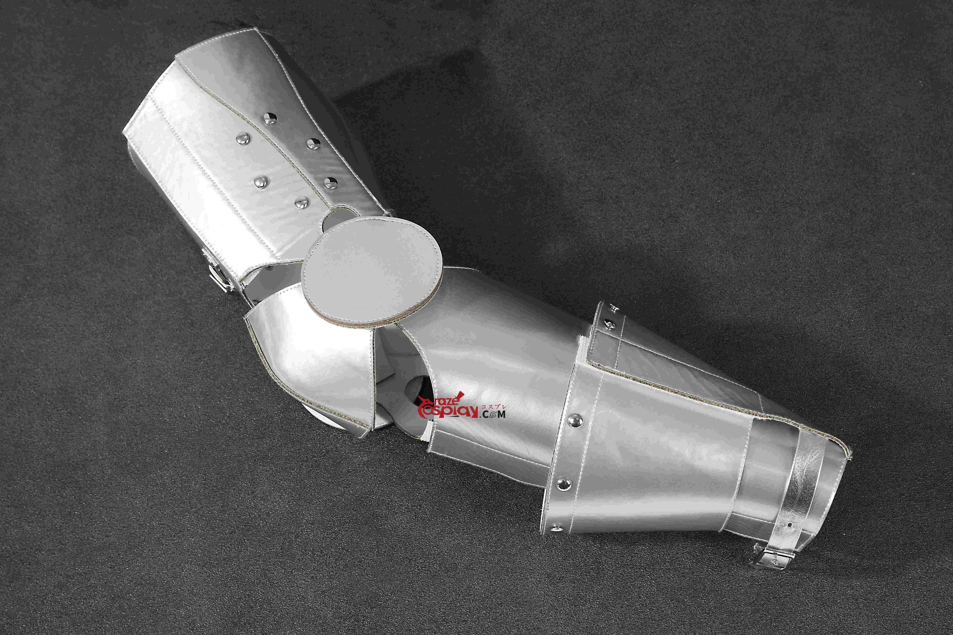 Arm/Thigh Guards: Pearlescent silver leather (non-stretch), PU leather (non-stretch).