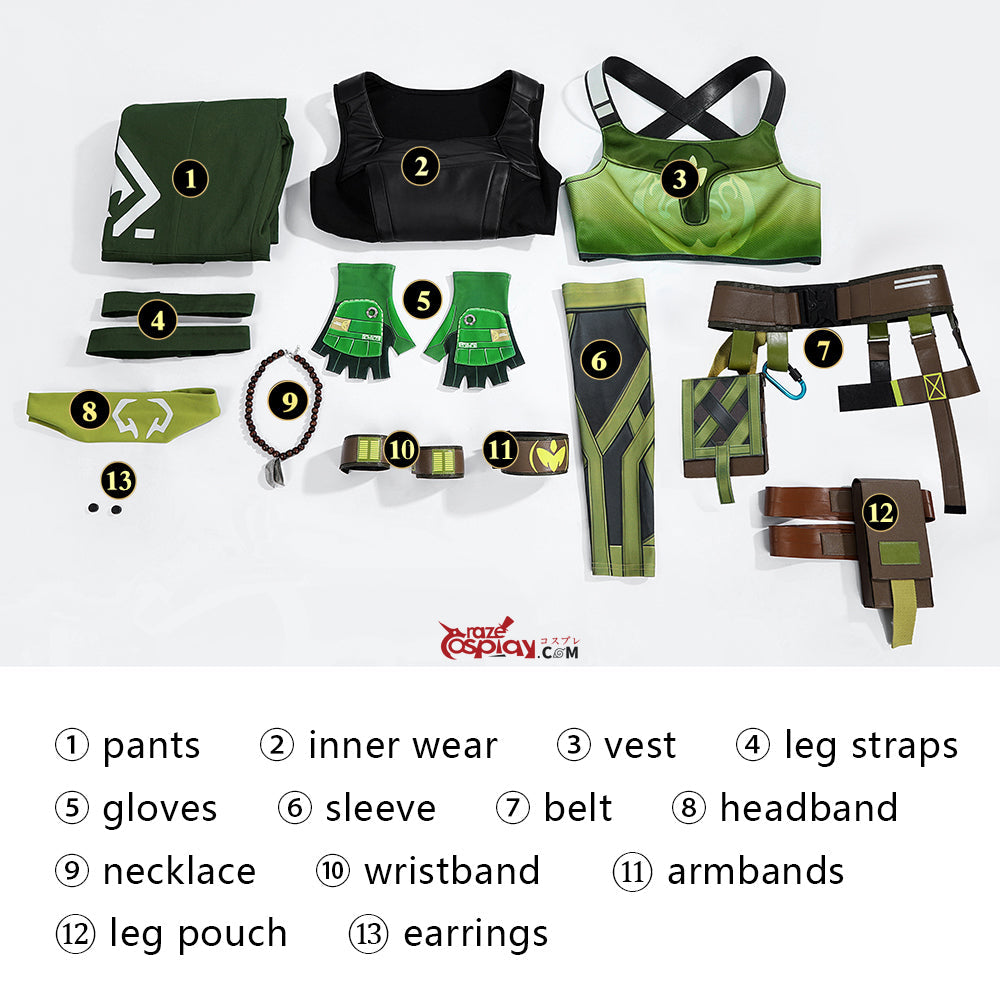Pants, Innerwear, Vest, Pants straps×2, Gloves×2, Arm sleeves, Carabiner, Belt + Waist bag, Headband, Necklace, Bracelets×2, Arm cuffs, Leg bag, Ear accessories