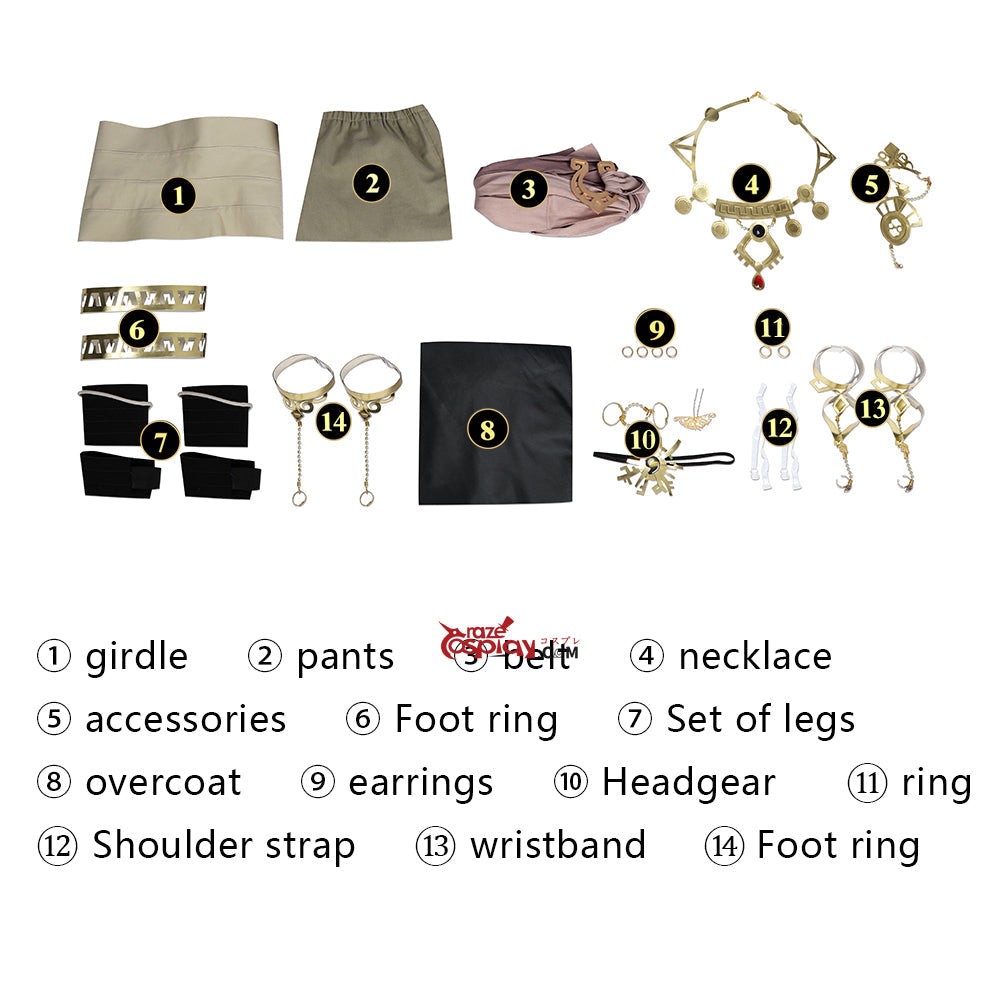 Waist Cincher, Pants, Belt, Necklace, Shoulder Pauldrons, Leg Rings, Leggings, Coat, Ear Cuffs, Headpiece, Ring, Transparent Shoulder Straps, Bracelet, Anklet