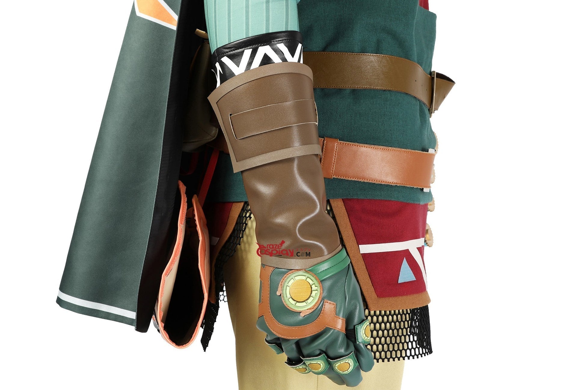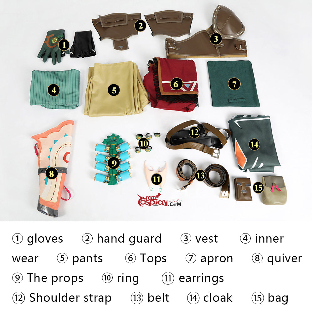 Gloves*2, Bracers*2, Vest, Innerwear, Pants, Tunic, Waist Wrap, Quiver (with strap clips), Detachable Sheikah Rune Prop, Rings*5 (left/right hand set), Earrings*4 (ancient-style studs + pendants), Cross Shoulder Straps (left-to-right diagonal), Belts*2 (front/back tactical straps), Cape (magnetic detachable clasp), Utility Waist Bag (multi-slot design)