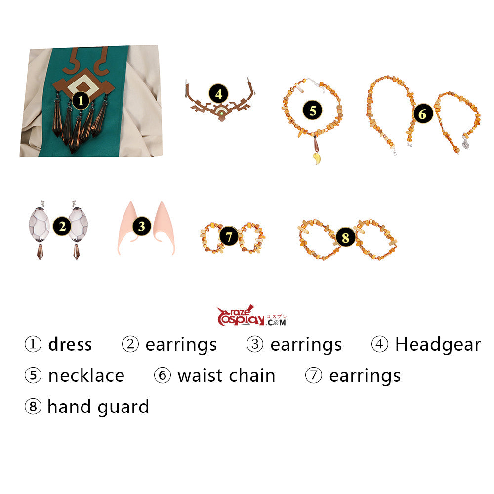 Gown, Ear Clips, Earrings, Headpiece, Necklace, Arm Cuffs, Bracelets, Waist Chain