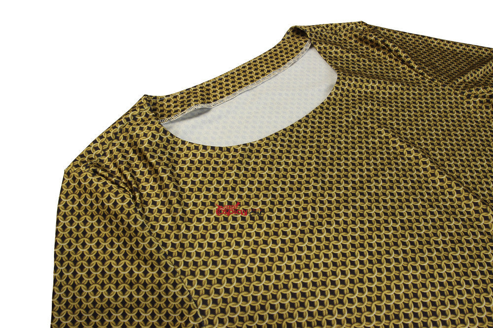 Layered Tunic System, Base Green Sleeveless Shirt, Mid-layer Chainmail-Print Tunic, Cream Long-Sleeve Overcoat, Detachable Belt System with Pouch, Articulated Combat Pants, Leather Bracers & Fingerless Gloves, Felt Adventurer’s Cap, Non-slip Ankle Boots